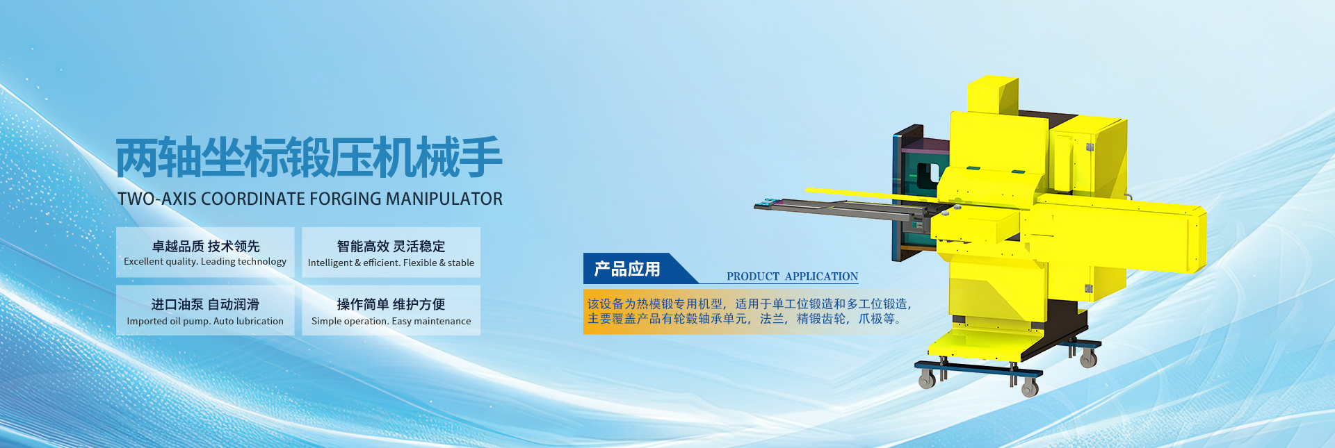 現(xiàn)在鍛壓自動(dòng)化機(jī)器人已廣泛應(yīng)用到工程機(jī)械配件、汽車(chē)配件、重卡配件、鋁鍛配件、精鍛配件、農(nóng)機(jī)配件、煤機(jī)配件、管件、索具、吊具、火車(chē)輪船、航空航天、軌道等各個(gè)領(lǐng)域。